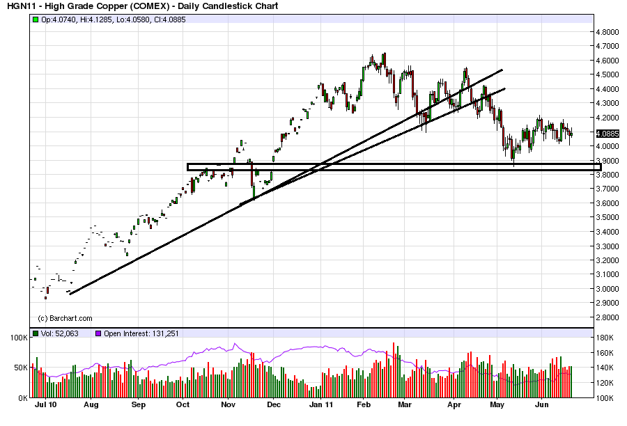 The primary point made by the one year chart is prices have broken a long-term uptrend. However, also note that from a long-term perspective prices have not dropped as sharply as anticipated given the overall weakness of the current economic numbers.