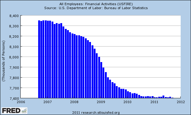 Above is a chart for total financial services, which shows an overall net loss with no gain. In fact, the peak to trough includes a trough established in the last employment report. The net result is this sector of the economy has lost 748,000 jobs in the last five years.