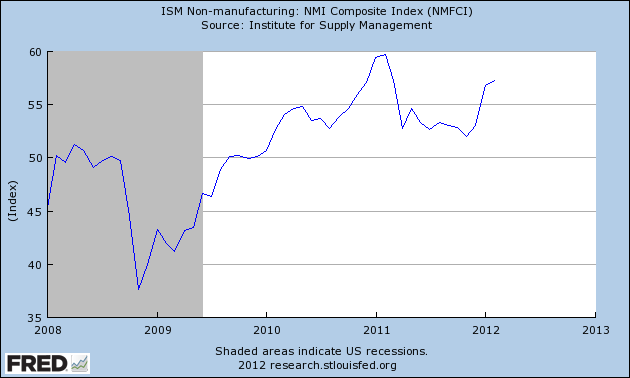 The overall ISM services index is currently at its highest level in a year. Also note that even when the economy slowed down last fall, we don't see signs of a contraction in the ISM index