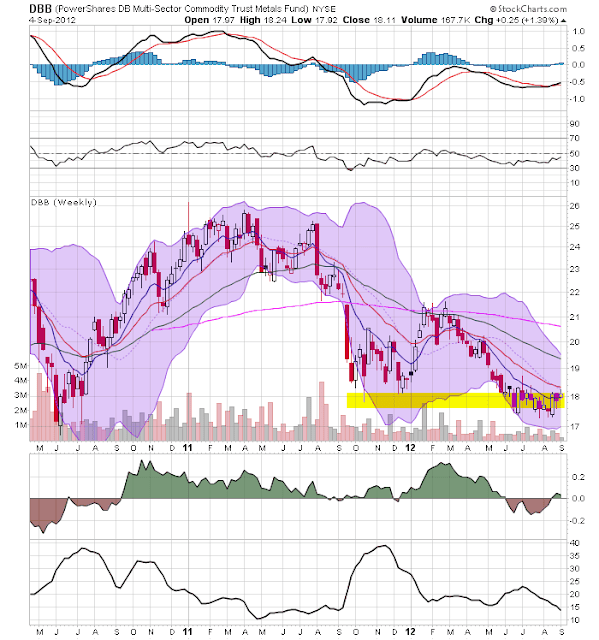 GLD has broken through resistance around the 158 area, rallied, sold-off in a downward sloping penant pattern to the 10 day EMA and moved higher again. Note the bullish EMA picture and rising CMF/MACD.