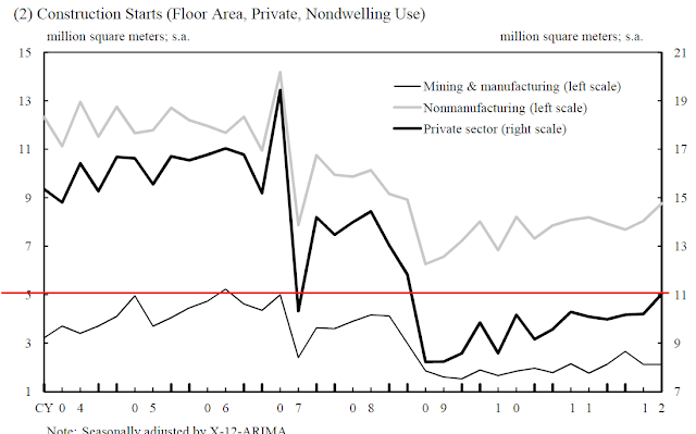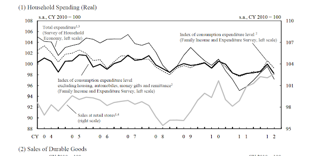 The above chart simply puts numbers to gross real GDP and its components for the last 5 quarters. In three of the last five quarters, we've had either marginal growth (.1% in 2Q12) or negative Q/Q growth (4Q11 and 3Q12). Private demand has been terrible. Residential investment has been slow for 5 straight quarters. Private consumption has dropped for the latest 2 quarters and non-residential investment has either been negative or only growth lightly in the last three quarters. The real problem for Japan has been the negative export picture. In three of the last four quarters, exports have contracted, while in only one have we seen an increase -- and then only a moderate one.