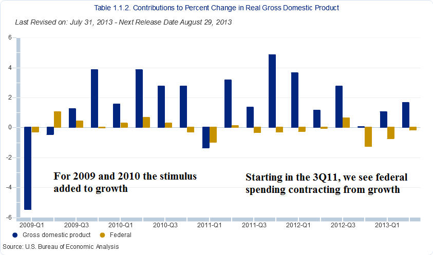 Let's fast forward to 3Q11 when we start to see incredibly stupid budget shenanigans occur in Washington followed by the implementation of the sequester in 4Q12. Notice for these quarters we see the federal government's contribution take away from overall growth. And as Frankel points out, for the last three quarters the real effects of the sequester really start to bite in a statistically significant way.