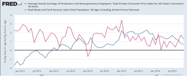 During this entire expansion, nominal wages for nonsupervisory employees have not grown faster than 2.6% YoY. Since we are still adding jobs faster than the labor force is growing, there ought to be at least a little further improvement than that. But in the last 9 months alone consumer prices have increased by 1.9%, causing real wages to stagnate (blue in the graph below).