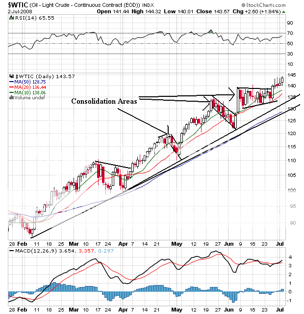 Oil is the 800 pound gorilla in the room. This chart is incredibly bullish. First, notice that for the last year oil has continually moved higher. As it has moved higher it has consolidated gains and then made hew highs. Also notice the following: