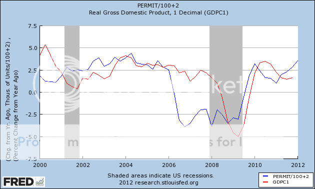 Permits are an excellent leading indicator for the direction, if not the range, of the unemployment rate over a year later. The increase in permits in the last year strongly suggests that the unemployment rate is going to continue to fall by at least a small percentage for the duration of 2012 and into 2013.