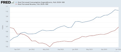 In summary, with the exception of real spending on goods - which really just took back December’s big increases - this was an excellent report. Inflation is now very close to the Fed’s preferred baseline rate, and both incomes and spending are up substantially. As I wrote last month, you would be well within your rights to call this a “Goldilocks” economy.