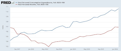 Also as indicated above, the NBER pays particular attention to several other aspects of this release. Real income excluding government transfers (like the 2020 and 2021 stimulus payments) declined -0.1% for the month, the first such decline since November 2022: